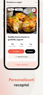 Pradėkite savo kelionę sveikesnio gyvenimo link su programa, kuri išties supranta Jūsų unikalius poreikius. Pamirškite generic mitybos planus – ši išmani sistema sukuria asmeninį valgiaraštį, pritaikytą būtent Jums, atsižvelgiant į amžių, fizinio aktyvumo lygį, konkrečius tikslus (svorio metimas, palaikymas ar raumenų auginimas) ir netgi Jūsų skonio preferencijas. Kiekvienas receptas yra kruopščiai sudarytas, pateikiant tikslų kalorijų skaičių ir makroelementų (baltymų, riebalų, angliavandenių) pasiskirstymą, užtikrinant, kad tiksliai žinotumėte, ką valgote ir kaip tai prisideda prie Jūsų sveikatos. Tai ne tik planavimas, tai – protingas požiūris į mitybą, kuriuo remiasi Jūsų sėkmė.