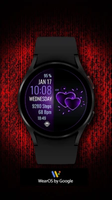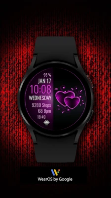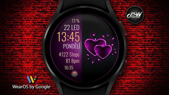„PW96 Valentine's Embrace Heart" – romantiškas WearOS ciferblatas, sukurtas švęsti Valentino dieną. Jame rasite persipynusių širdžių motyvą, keičiamus 12/24 valandų formatus bei pritaikomas fono ir teksto spalvas. Stebėkite žingsnius, širdies ritmą ir baterijos būseną su šiuo meilės kupinu dizainu.
