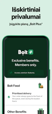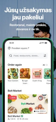 Programėlės „Bolt Food" patirtis yra sukurta galvojant apie jūsų komfortą ir ramybę. Vos nurodę pristatymo adresą, iš karto matysite platų restoranų ir „Bolt Market" parduotuvių asortimentą. Visiškai patvirtinus užsakymą, galite ramiai sekti jo eigą realiu laiku – nuo paruošimo iki kurjerio atvykimo. Sklandus mobilusis mokėjimas užtikrina greitą ir saugų atsiskaitymą be jokių rūpesčių. Tiems, kurie vertina dar didesnį efektyvumą ir išskirtines privilegijas, „Bolt Plus" suteikia galimybę mėgautis prioritetiniu pristatymu net ir piko valandomis, padedant sutaupyti brangaus laiko ir pinigų. Atkreipkite dėmesį, kad „Bolt Market" ir „Bolt Plus" paslaugos prieinamos tik pasirinktose rinkose ir miestuose.