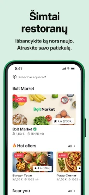 Atraskite naują patogumo dimensiją su programėle „Bolt Food", kuri jūsų kulinarines svajones ir kasdienes maisto produktų reikmes paverčia realybe vos keliais prisilietimais. Ši intuityvi platforma sujungia jus su gausiu restoranų pasirinkimu ir operatyviai veikiančiomis „Bolt Market" parduotuvėmis, užtikrindama greitą ir sklandų pristatymą tiesiai iki jūsų durų. Nuo gurmaniškų patiekalų iki būtiniausių bakalėjos prekių – viskas pasiekiama vienoje vietoje. Be to, mėgaukitės lankstumu pasirinkdami užsakymo atsiėmimą tiesiai iš jūsų mėgstamos vietos, taupydami laiką ir derindami su savo dienotvarke.