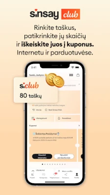 Kiekviena diena su Sinsay yra nauja galimybė sutaupyti ir atrasti. Pasinaudokite išskirtinėmis akcijomis ir nuolaidomis, kurios laukia jūsų programėlėje – nuo specialių nutrinamų kortelių ir „Dienos prekės" pasiūlymų iki įtraukiančių iššūkių, kurie padės sumažinti jūsų pirkinių krepšelio kainą. Negana to, prisijungę prie Sinsay Klubo, tapsite bendruomenės dalimi, kur kiekvienas pirkinys virsta taškais, o šie – vertingais kuponais, leidžiančiais sutaupyti iki 16 EUR. Mėgaukitės privilegijomis ir pasiūlymais, skirtais tik ištikimiausiems klientams.