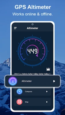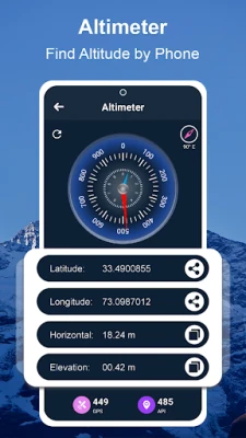 Keliaukite su pasitikėjimu, nes Aukščiamačio programa siūlo išsamius žemėlapius, veikiančius tiek internetu, tiek be jo, pritaikytus įvairioms situacijoms. Rinkitės iš reljefo, hibridinio ar palydovinio režimo, kad geriausiai atspindėtumėte savo aplinką. Integruotas GPS aukščiamačio kompasas tampa jūsų patikimu kelrodžiu, tiksliai nurodančiu kryptį, padedančiu rasti adresą pagal platumą ir ilgumą bei matuojančiu nuolydžio lygį. Šis galingas įrankis teikia informaciją apie magnetinę kryptį ir tikrąją kryptį, užtikrindamas, kad visada žinotumėte, kur einate.